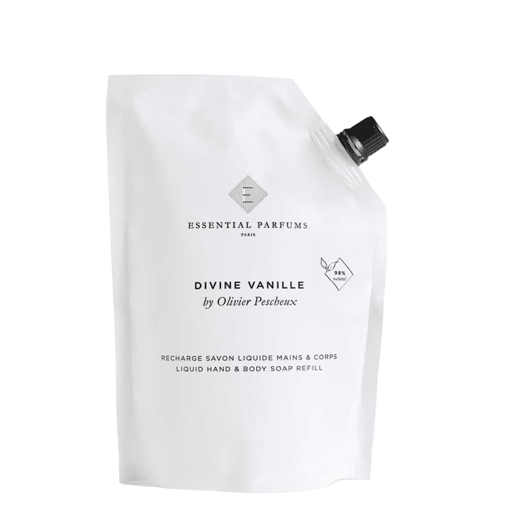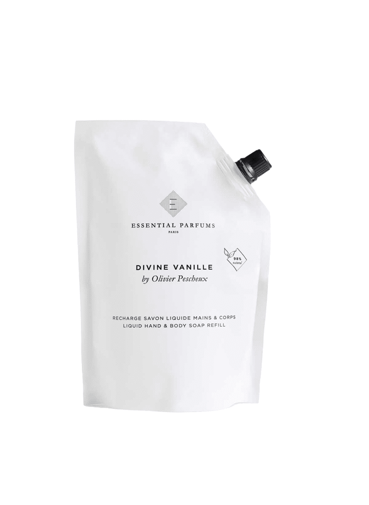 Savon liquide corps & mains recharge, 98% naturel et délicatement parfumé avec Divine Vanille by Olivier Pescheux.